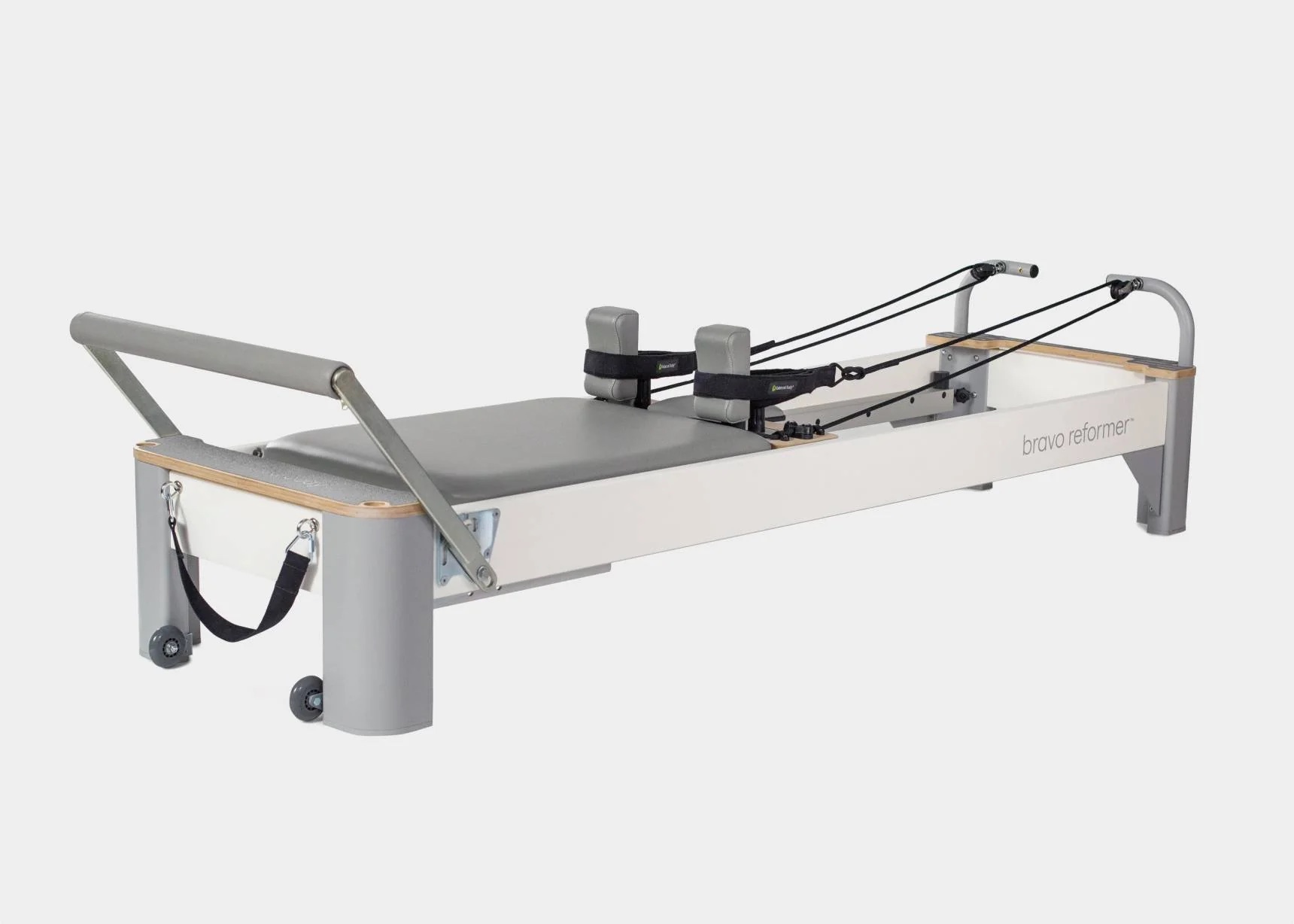 Bravo Reformer è dotato inoltre del sistema Twist-Lock, che consente una regolazione dei poggiaspalle rapida e sicura, e del Soft Touch Rope System, che assicura transizioni fluide e silenziose.